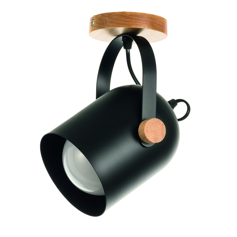 Πρόκειται για ένα σποτ κατασκευασμένο από μαύρο μέταλλο και ξύλινες λεπτομέρειες. Η βάση του είναι επίσης κατασκευασμένη από ξύλο. Το μεταλλικό καπάκι του κινείται για να προσαρμοστεί ιδανικά σε οποιονδήποτε εσωτερικό χώρο. Μπορεί να τοποθετηθεί είτε στην οροφή είτε στον τοίχο.