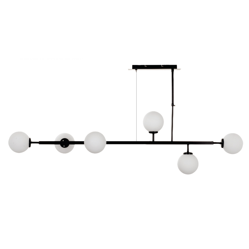 Πρόκειται για ένα μαύρο μεταλλικό κρεμαστό φωτιστικό με λευκή οπαλίνα και έξι λαμπτήρες. Τοποθετείται ιδανικά πάνω από τετράγωνα και ορθογώνια τραπέζια, ώστε να επιτευχθεί ομοιομορφία. Η ανάρτησή του δίνει τη δυνατότητα να προσαρμοστεί στον μοντέρνο χώρο τοποθέτησή του.