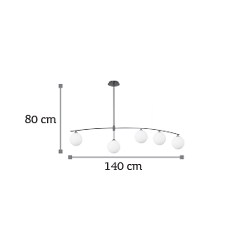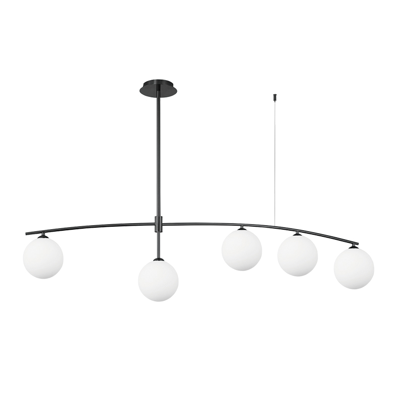 Πρόκειται για ένα μαύρο μεταλλικό φωτιστικό με λευκή οπαλίνα στο τελείωμα και πέντε λαμπτήρες. Η μίνιμαλ σχεδίασή του το τοποθετεί ιδανικά σε οποιονδήποτε μοντέρνο εσωτερικό χώρο.