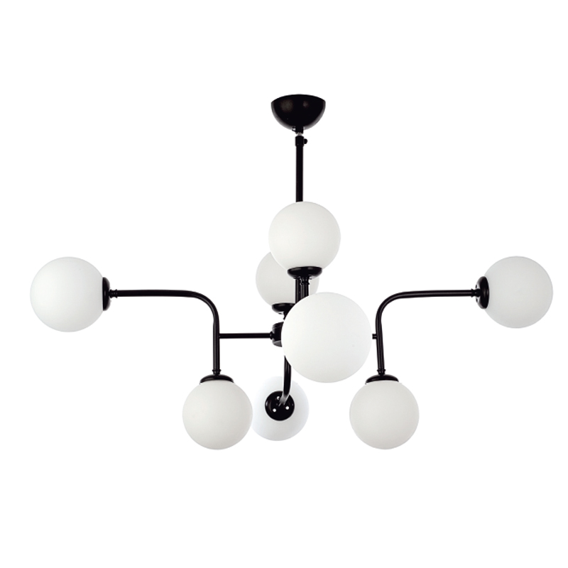 Πρόκειται για ένα μαύρο μεταλλικό φωτιστικό με λευκή οπαλίνα και οχτώ λαμπτήρες. Η μίνιμαλ και ιδιαίτερη σχεδίασή του το κατατάσσει στη μοντέρνα εσωτερική διακόσμηση κυρίως. Η μεταλλική χρώμιο ανάρτηση είναι ρυθμιζόμενη για να προσαρμοστεί ιδανικά στον χώρο τοποθέτησής του.