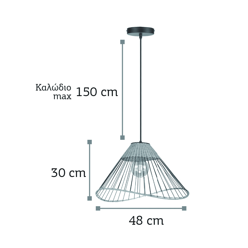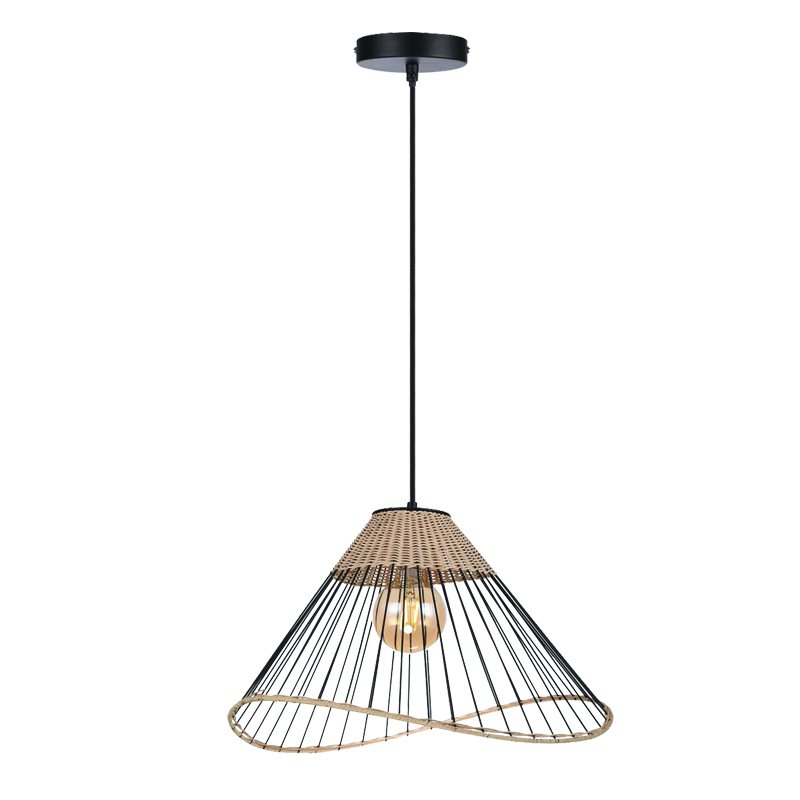 Ένα κρεμαστό φωτιστικό κατασκευασμένο από ρατάν κατάλληλο για ποικίλους εσωτερικούς χώρους. Αποτελεί την ιδανική επιλογή για όποιον επιθυμεί μια πιο χαλαρή διάθεση στον χώρο του. Το μαύρο μέταλλο προσδίδει ένα ιδιαίτερο design. Η ανάρτηση προσαρμόζεται στο ύψος του κάθε χώρου.