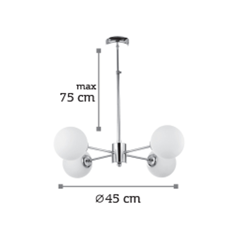 Πρόκειται για ένα χρυσό ματ μεταλλικό φωτιστικό με λευκή οπαλίνα στο τελείωμα και τέσσερις λαμπτήρες. Η μίνιμαλ σχεδίασή του το τοποθετεί ιδανικά σε οποιονδήποτε μοντέρνο αλλά και πιο κλασσικό εσωτερικό χώρο. Η ανάρτησή του είναι μεταλλική και ρυθμιζόμενη ώστε να προσαρμοστεί ιδανικά στον χώρο τοποθέτησής του.