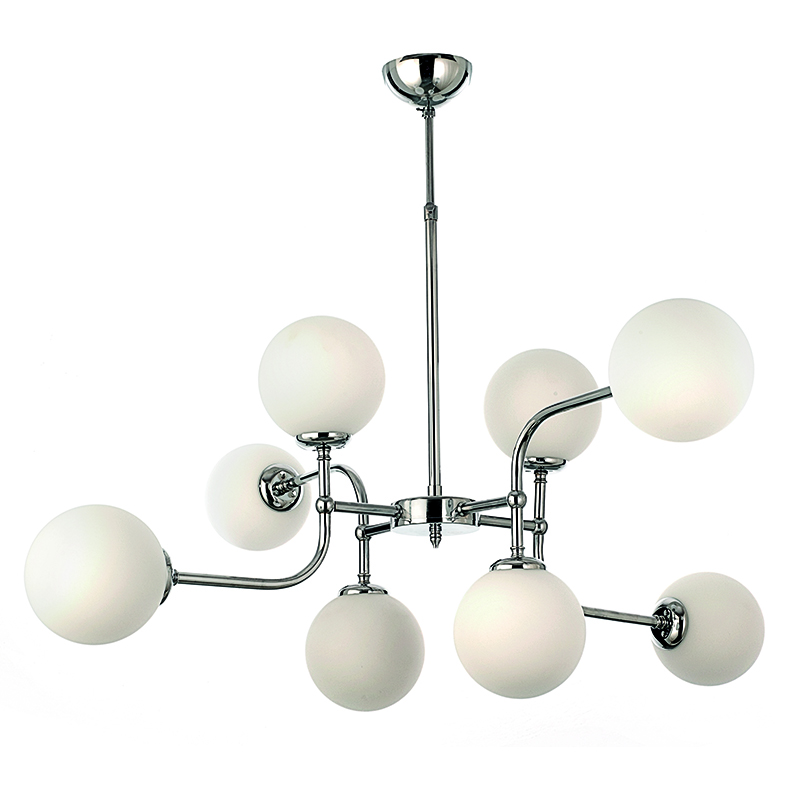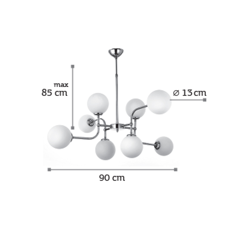 Πρόκειται για ένα χρώμιο μεταλλικό φωτιστικό με λευκή οπαλίνα και οχτώ λαμπτήρες. Η μίνιμαλ και ιδιαίτερη σχεδίασή του το κατατάσσει στη μοντέρνα εσωτερική διακόσμηση κυρίως. Η μεταλλική χρώμιο ανάρτηση είναι ρυθμιζόμενη για να προσαρμοστεί ιδανικά στον χώρο τοποθέτησής του.
